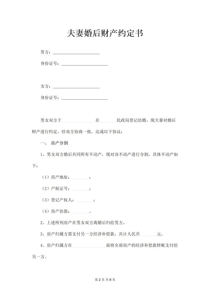 本合同模板为《夫妻婚后财产约定书》,适用于男女双方为夫妻关系,现夫妻对婚后财产进行约定,经双方协商一致,达成以下协议。