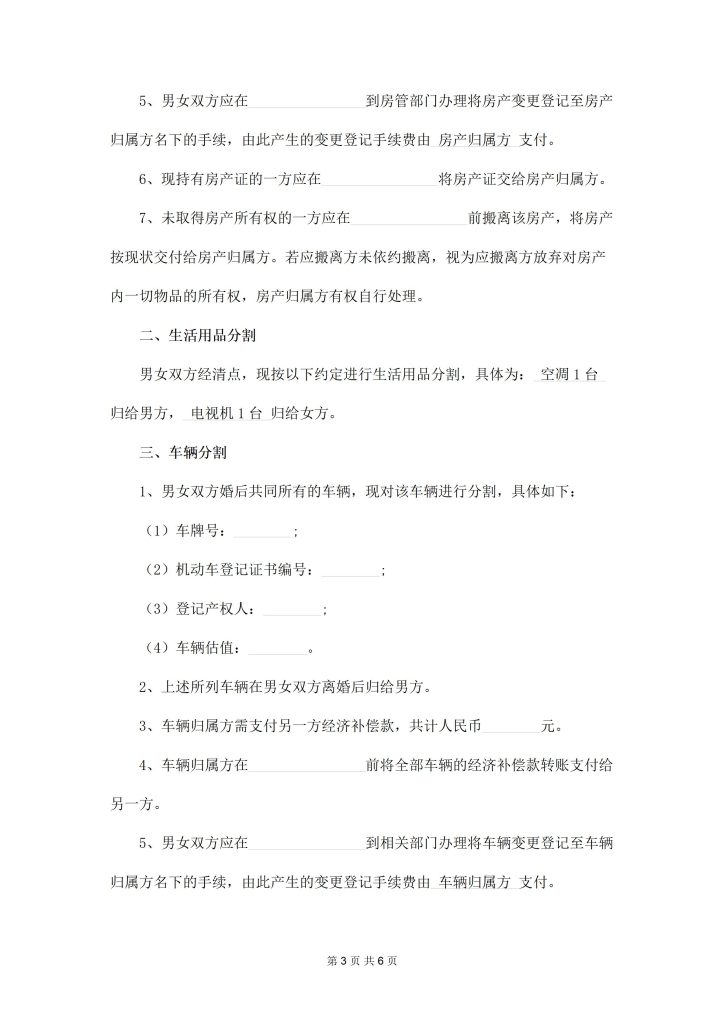 7、未取得房产所有权的一方应在 前搬离该房产,将房产按现状交付给房产归属方。若应搬离方未依约搬离,视为应搬离方放弃对房产内一切物品的所有权,房产归属方有权自行处理。