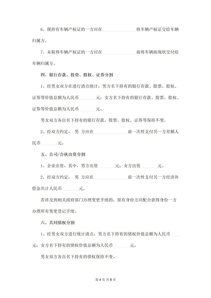 1、经男女双方在进行清点统计,男方名下持有的银行存款、股票、股权、证券等价值总额为人民币 元;女方名下持有的银行存款、股票、股权、证券等价值总额为人民币 元。