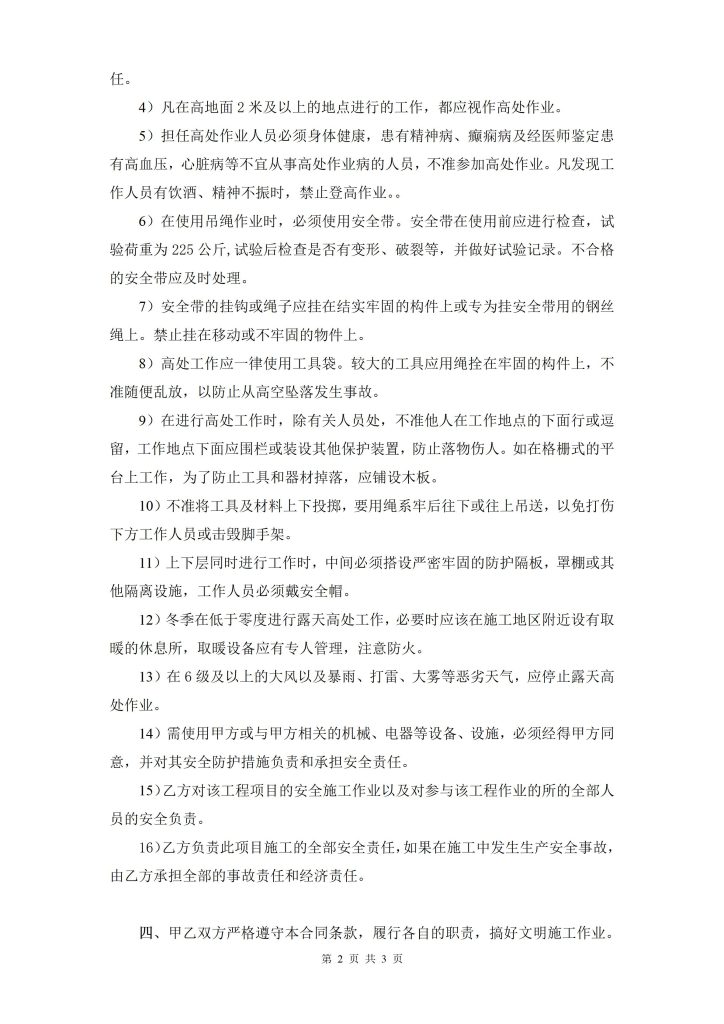 本合同模板为《高空作业安全协议》,适用于甲方指定乙方为某工程施工,确保服务项目能安全优质地按时完成,特签订如下合同。约定:乙方负责此项目施工的全部安全责任,如果在施工中发生生产安全事故,由乙方承担全部的事故责任和经济责任。