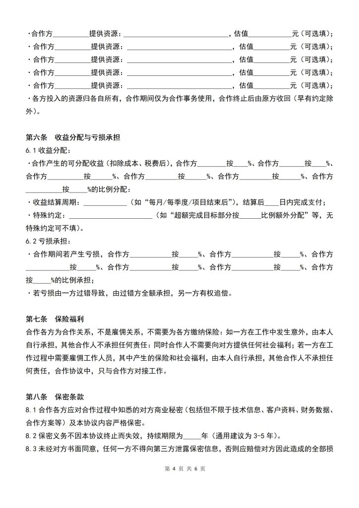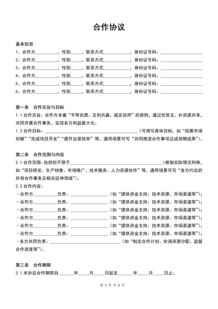 2.1合作范围:包括但不限于 (根据实际情况列举,如“项目研发、生产销售、市场推广、技术服务、人力资源协作”等,通用场景可写“各方约定的所有合作事务及相关延伸领域”)。