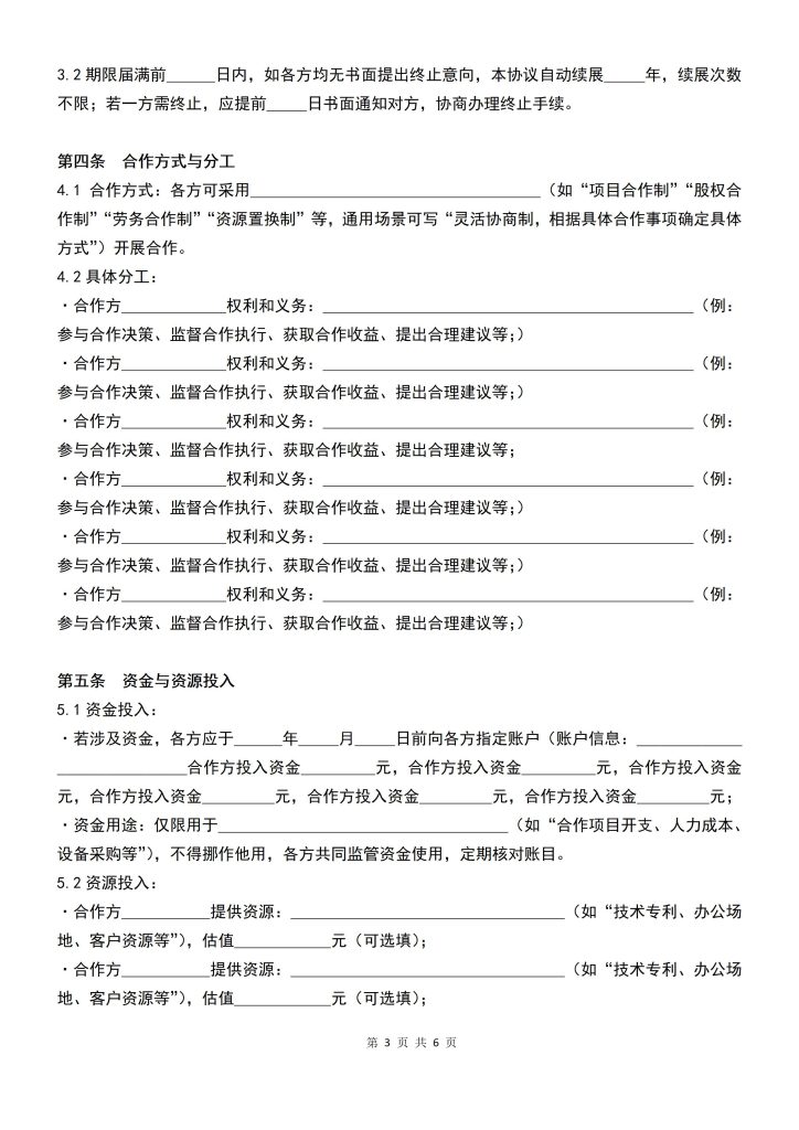 - 合作方 负责: (如“提供资金支持、技术资源、市场渠道等”);