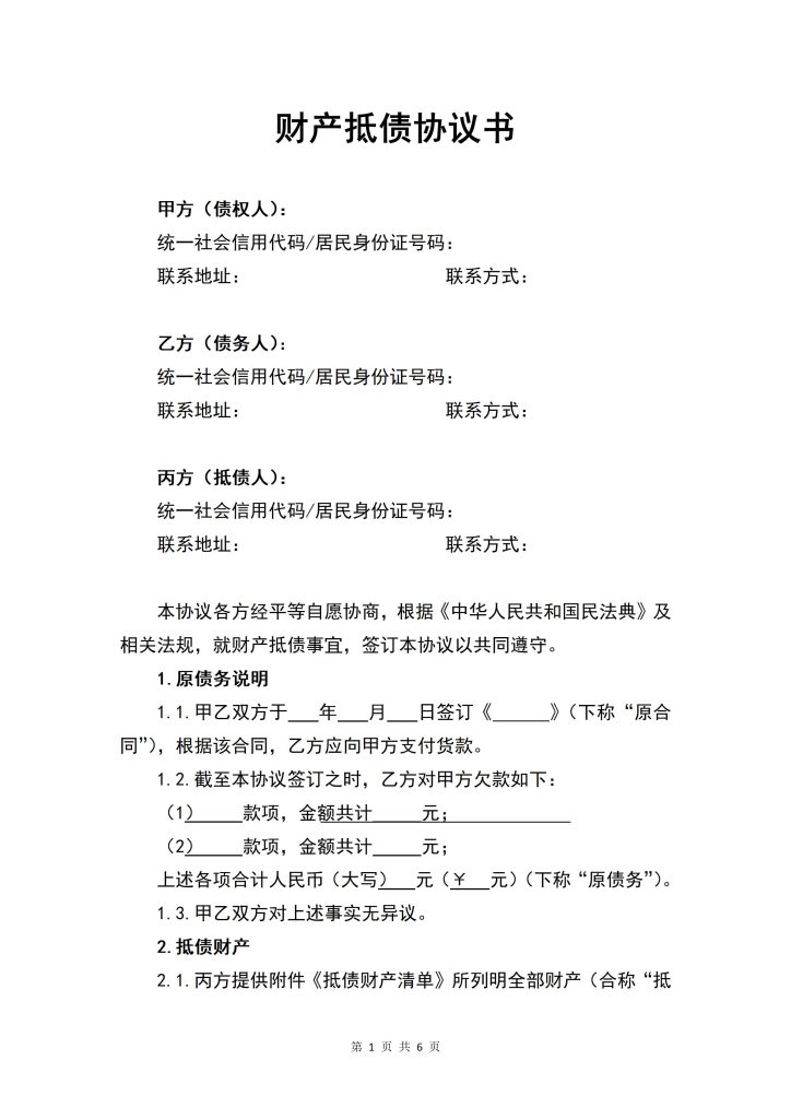 本协议各方经平等自愿协商,根据《中华人民共和国民法典》及相关法规,就财产抵债事宜,签订本协议以共同遵守。