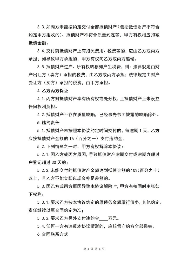 3.3.如丙方未能按约定交付全部抵债财产(包括抵债财产不符合约定甲方拒收的)、抵债财产不符合质量约定等,甲方有权相应扣减抵债金额。