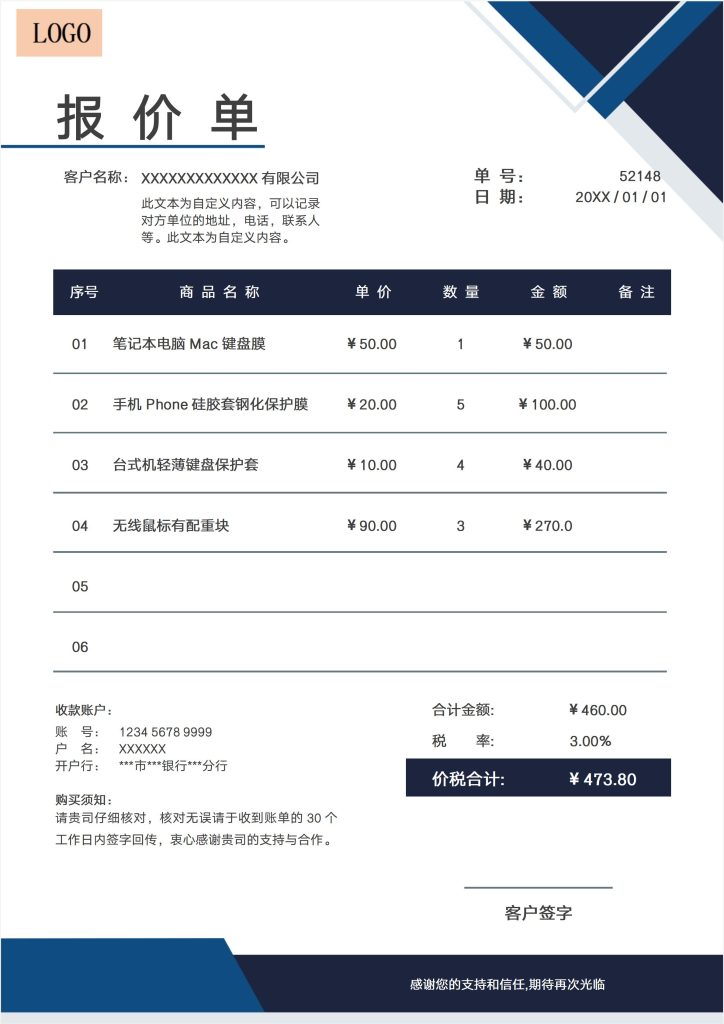 本模板为《报价单(含logo)》,适用于买方向卖方采购商品,卖方向买方提供详细报价。本报价单包含logo、收款账户信息等详细内容。