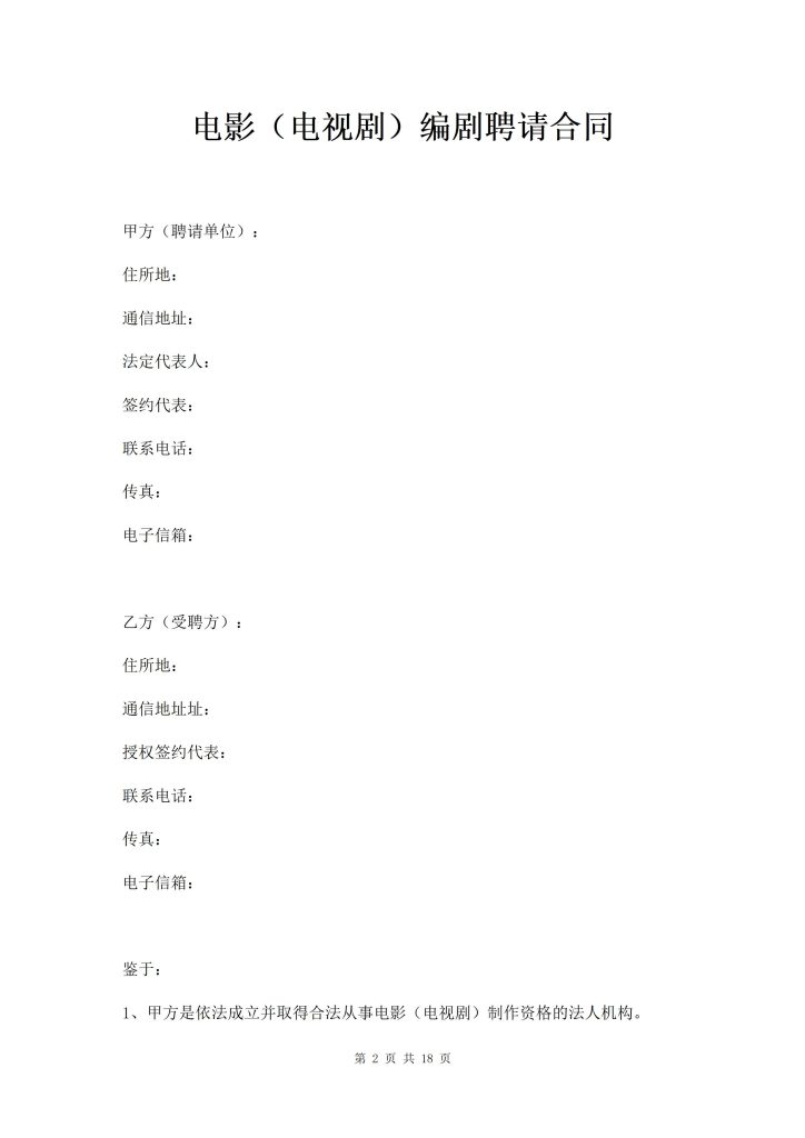 本合同模板为《电影电视剧编剧聘请合同》,适用于甲方是依法成立并取得合法从事电影(电视剧)制作资格的法人机构。甲方决定聘请乙方担任电影(电视剧)的编剧,乙方同意接受甲方的聘请。经友好协商,特达成本合同,以兹共同遵守。