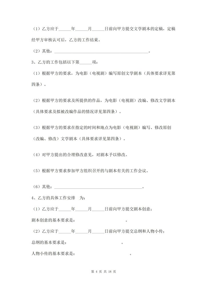 (2)根据甲方的要求及所提供的作品,为电影(电视剧)改编、修改文学剧本(具体要求及拟被改编作品的情况详见第四条)。