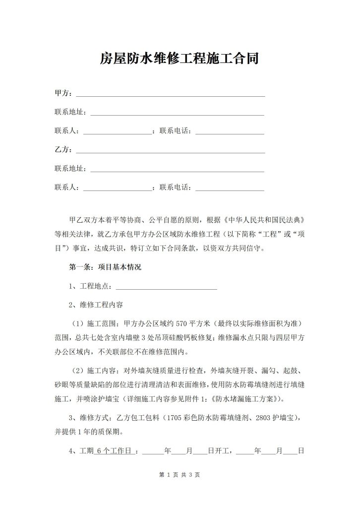 本合同模板为《房屋防水维修工程施工合同》,适用于甲乙双方本着平等协商、公平自愿的原则,根据《中华人民共和国民法典》等相关法律,就乙方承包甲方办公区域防水维修工程(以下简称“工程”或“项目”)事宜,达成共识,特订立如下合同条款,以资双方共同信守。