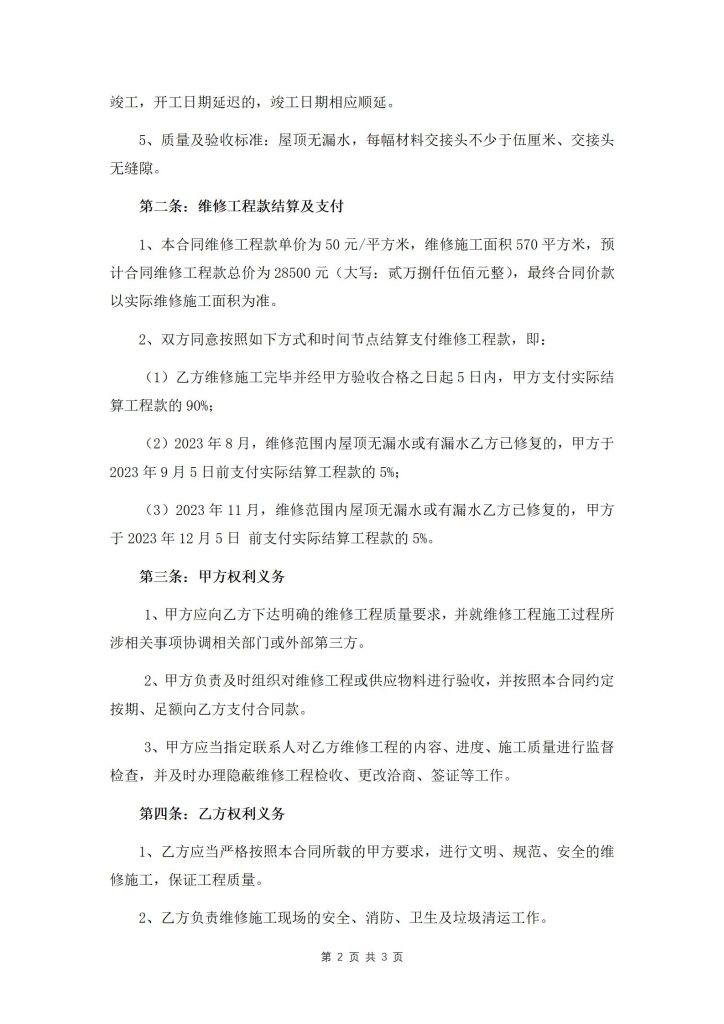 (2)2023年8月,维修范围内屋顶无漏水或有漏水乙方已修复的,甲方于2023年9月5日前支付实际结算工程款的5%;