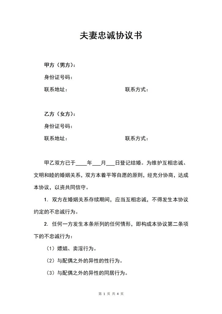 本合同模板为《夫妻忠诚协议书》,适用于夫妻双方约定在婚姻关系存续期间,应当互相忠诚,不得发生本协议约定的不忠诚行为。