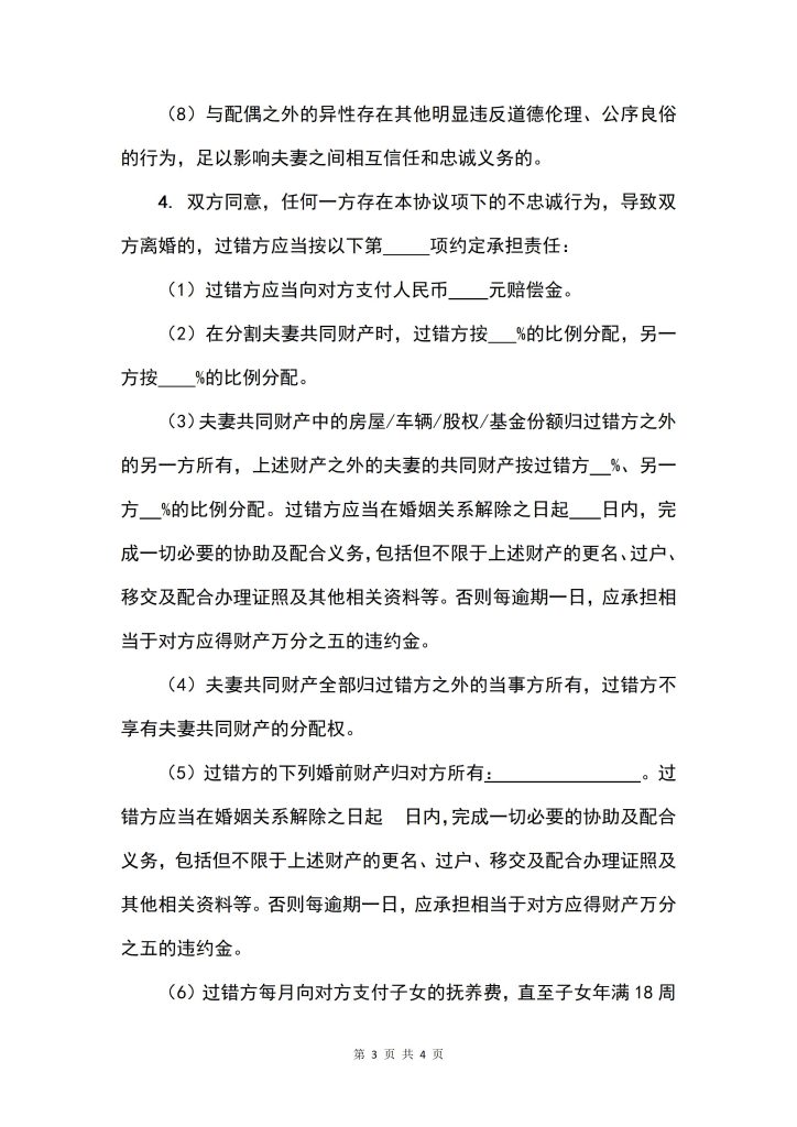 4. 双方同意,任何一方存在本协议项下的不忠诚行为,导致双方离婚的,过错方应当按以下第项约定承担责任: