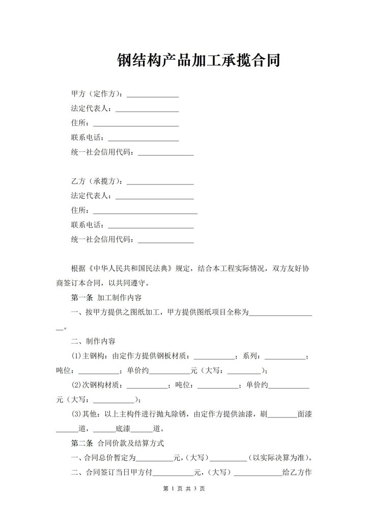 本合同模板为《钢结构产品加工承揽合同》,适用于乙方承揽甲方的钢结构产品加工任务,按甲方提供之图纸进行加工。
