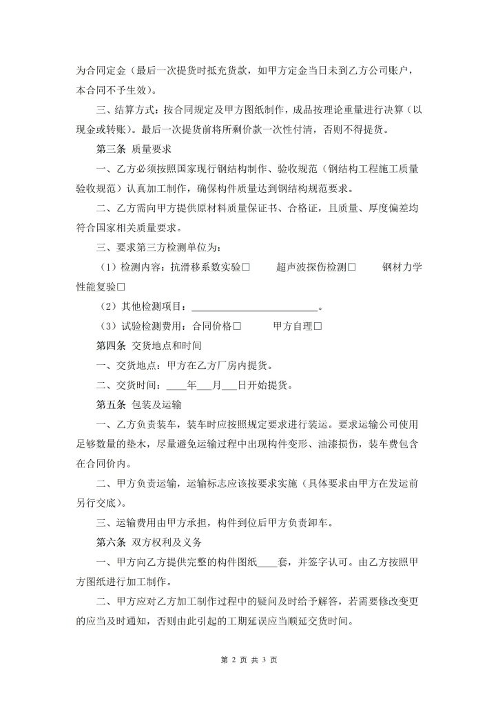 一、乙方必须按照国家现行钢结构制作、验收规范(钢结构工程施工质量验收规范)认真加工制作,确保构件质量达到钢结构规范要求。