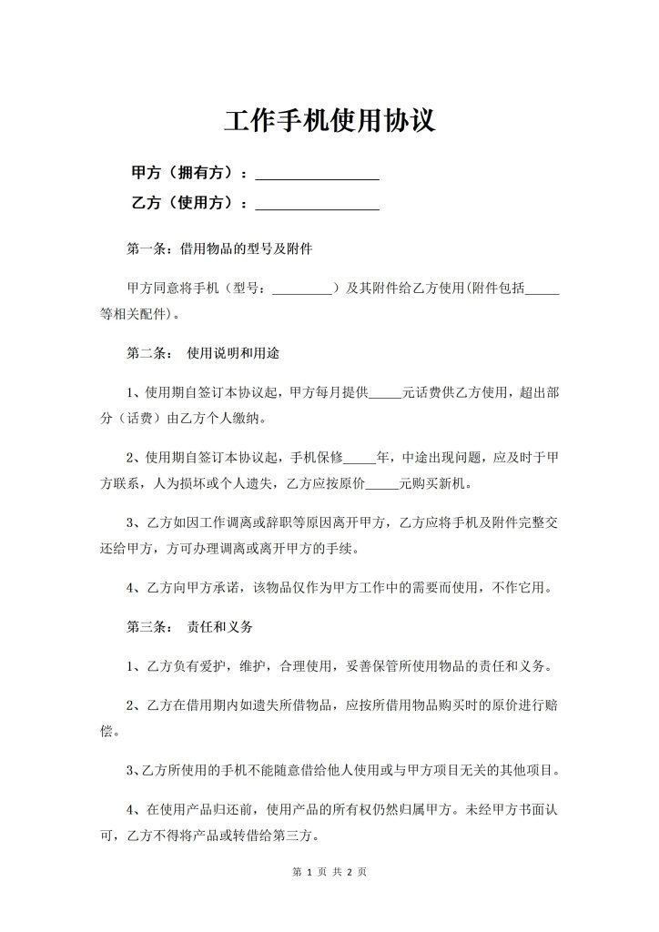 本合同模板为《工作手机使用协议》,适用于甲方(用人单位)将工作手机及其配件借给乙方(员工)使用时签订。