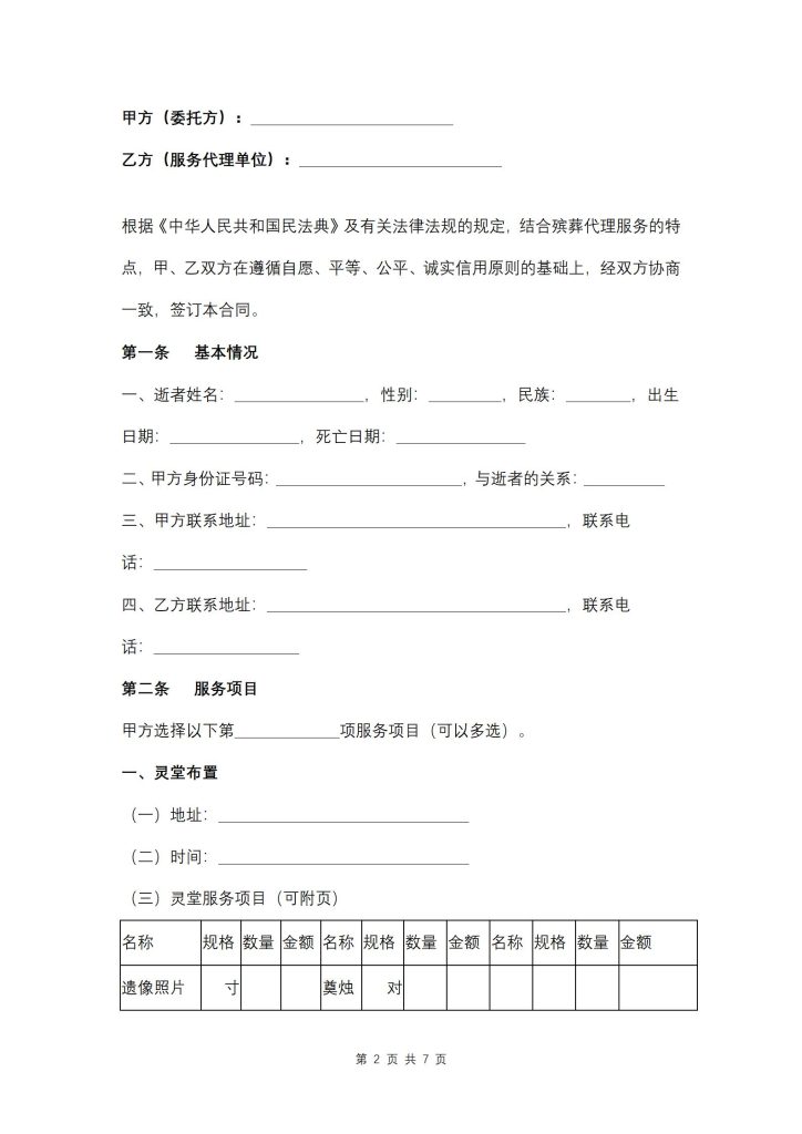 根据《中华人民共和国民法典》及有关法律法规的规定,结合殡葬代理服务的特点,甲、乙双方在遵循自愿、平等、公平、诚实信用原则的基础上,经双方协商一致,签订本合同。