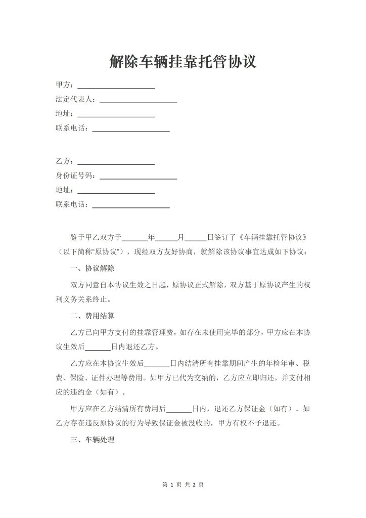 本合同模板为《解除车辆挂靠托管协议》,适用于由于甲乙双方此前签订了《车辆挂靠托管协议》,现经双方友好协商,就解除该协议事宜达成本协议。