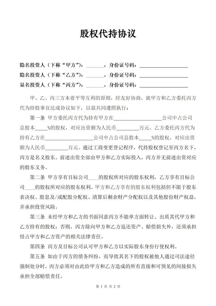 本合同模板为《股权代持协议》,适用于两人委托一人代持股份时签订,合同为简版,适合喜欢简洁的老板。